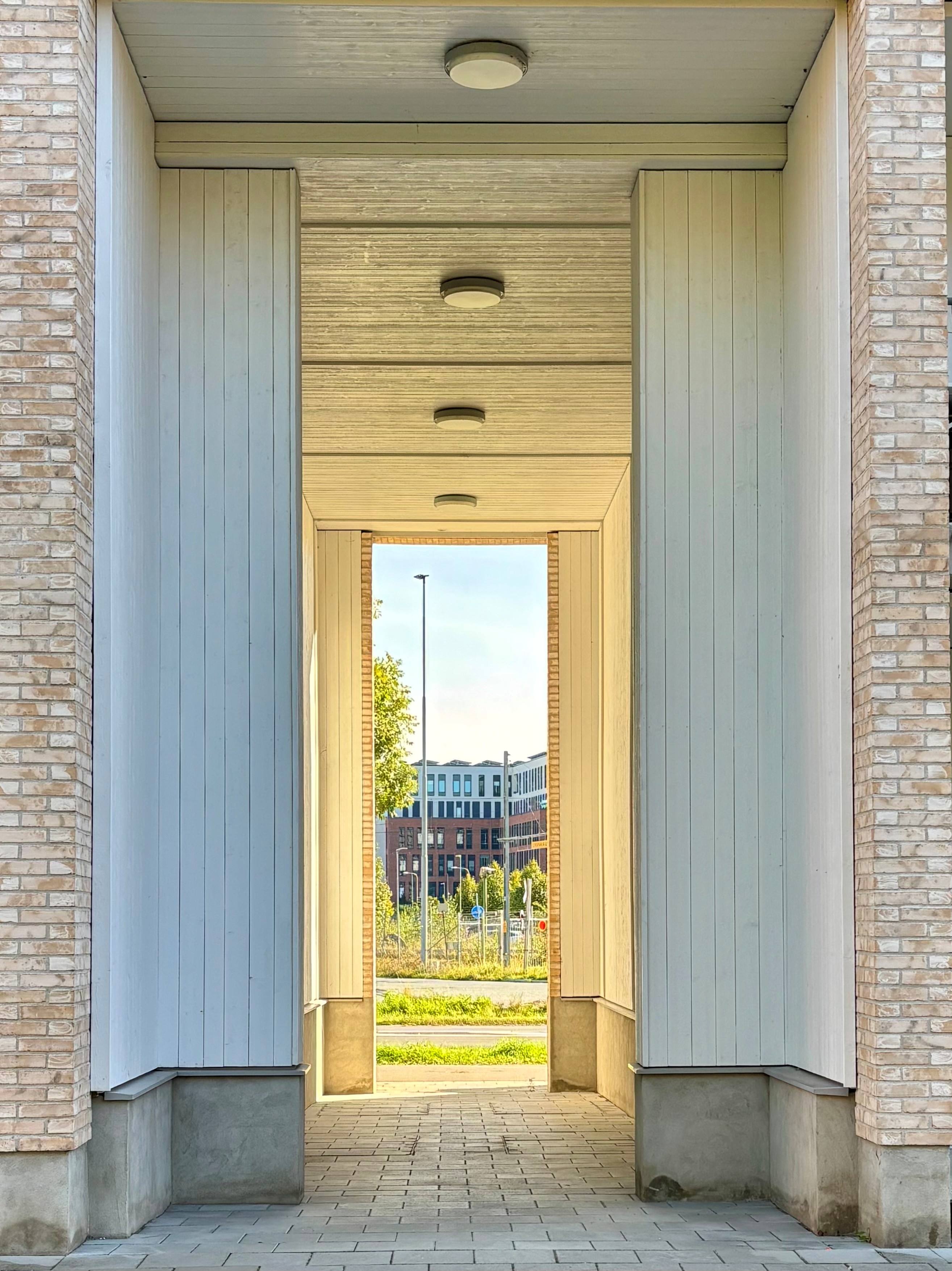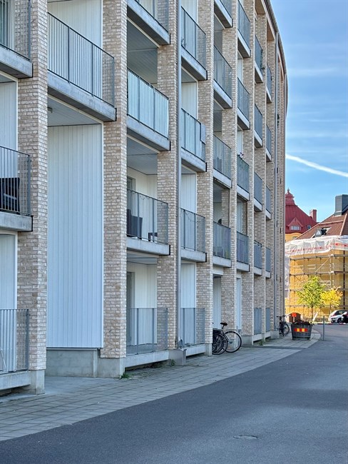 Lång böjd byggnadsvolym sluter två befintliga gårdar. Stark systematik för rationell produktion och anpassning till grannhusen. Samtliga lägenheter har längsgående balkonger mot gården, merparten är genomgående.Omslutande rum med enkel geometri, ofta i fil utmed fasad.